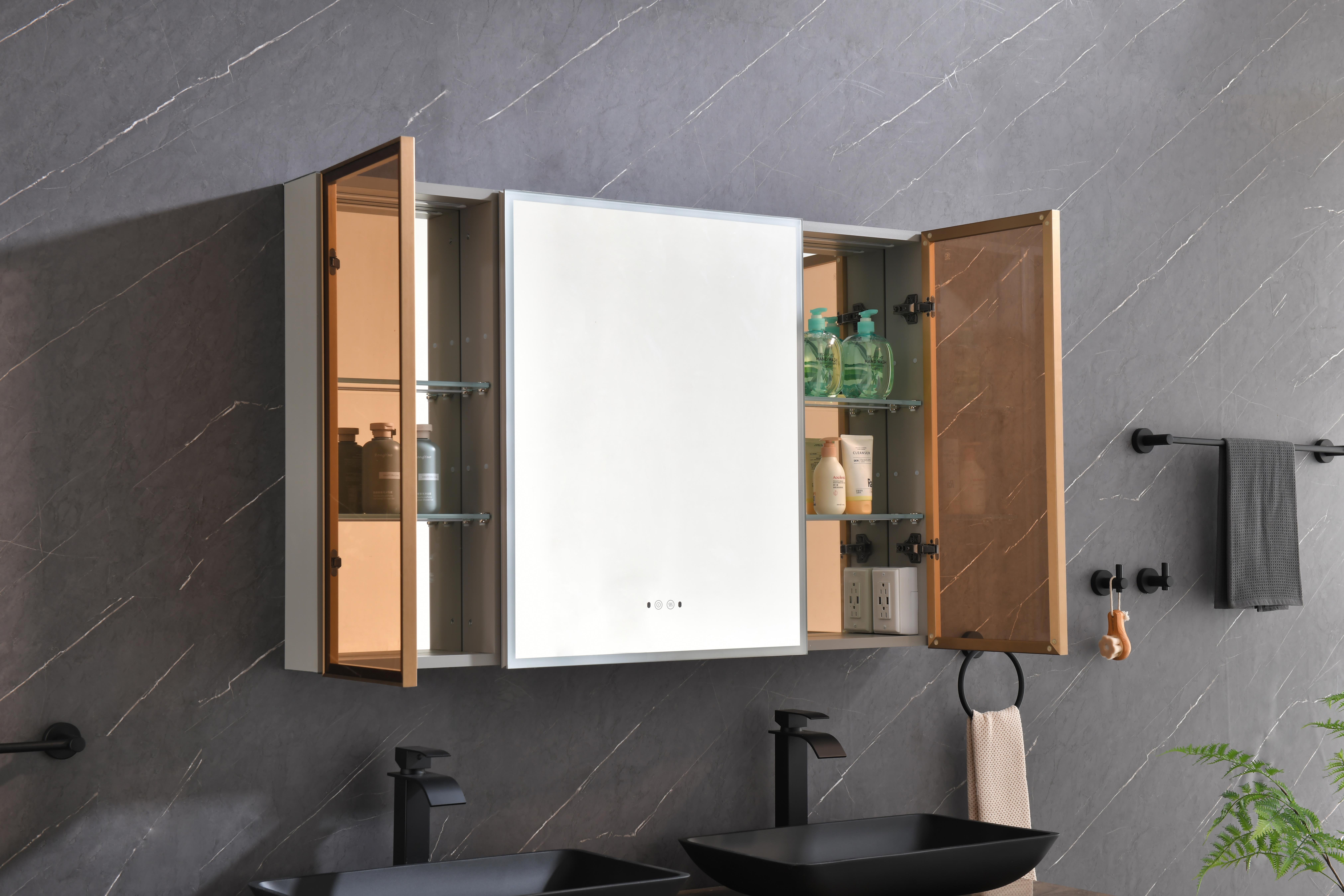 Medicine Cabinets with MirrorsRecessed or Surface Lighted Mirror Medicine Cabinet with Lights, LED Medicine Cabinet w/Defogger, Dimmer, 3X Makeup Mirror, Outlets & USBTHREE SOFT TOUCH SWITCH makes this LED Medicine Cabinet simple and easy to turn ON/OFF, adjust brightness and change color temperature. fogless makeup time is just one touch away.provides you three levels of brightness options: 5%,50%, 100%. COLOR TEMPERATURE ranges from 3000K - 6000K offers you choices of different light colors for different purposes. All these features make it the perfect led mirror medicine cabinet.Mirrors on both sides of the door, interior walls & both side panels, which makes it a bathroom cabinet with mirror on all sides.Three medicine cabinet shelf.Built-in 20Amp dual outlet and USB 2.0 port for phone or shavers charging inside this bathroom mirror medicine cabinet.3 TIMES AMPLIFY MIRROR makes it super easy for makeup tasks.and convenience to your bathroom.Smart memory function remembers your favorite setting, no need to adjust every time you turn on the mirror.CRI 90+ light source reproduces high-quality task lights perfect for making up. 5 mm COPPER FREE silver medicine cabinet mirror prevents black edges in the harsh bathroom environment.Guaranteed 50,000 hours lifetimes and 100,000 times switch touch.High-end hardware brandsoft close hinges and provides strong support for large medicine cabinet. rated Anodized Aluminum Frame for extra durability.Scratch-free painting finish. Grooved door edges and corners for safe use.48*30Inch bathroom medicine cabinet recessed or surfaced.Surface mount medicine cabinet, recessed medicine cabinet with lights and outlet. PLEASE BE AWARE, any LED medicine cabinet on the market cannot be served as the only lighting power source, additional lighting source may be necessary.